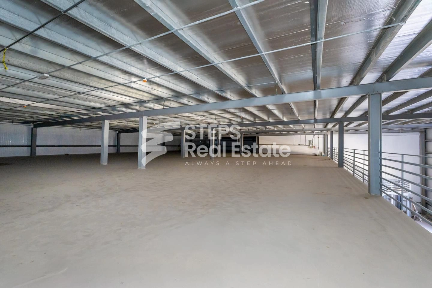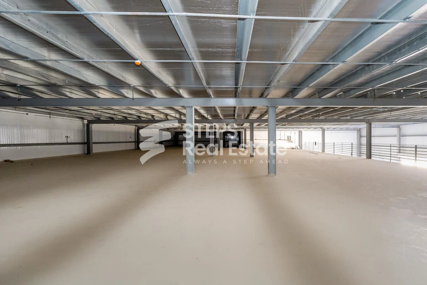 يتميز المستودع بطابق ميزانين يوفر مساحة إضافية يمكن استخدامها كمكاتب إدارية أو للتخزين أو لأنشطة الإنتاج الخفيفة، مما يجعله خيارًا مثاليًا لشركات الخدمات اللوجستية أو التصنيع أو التوزيع.
