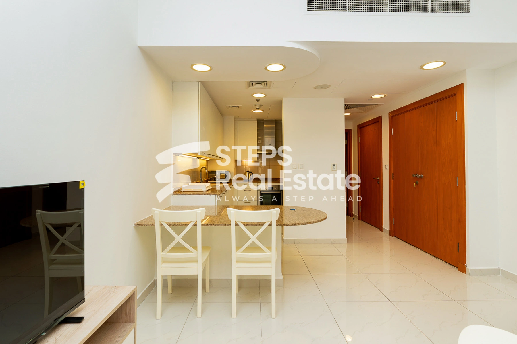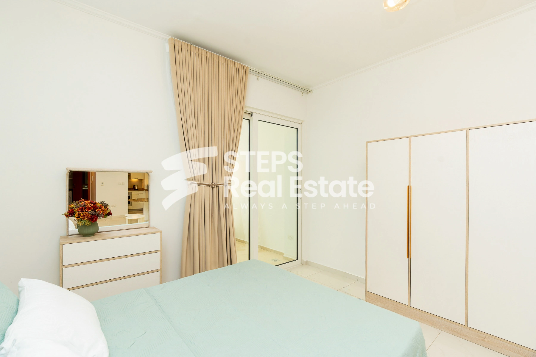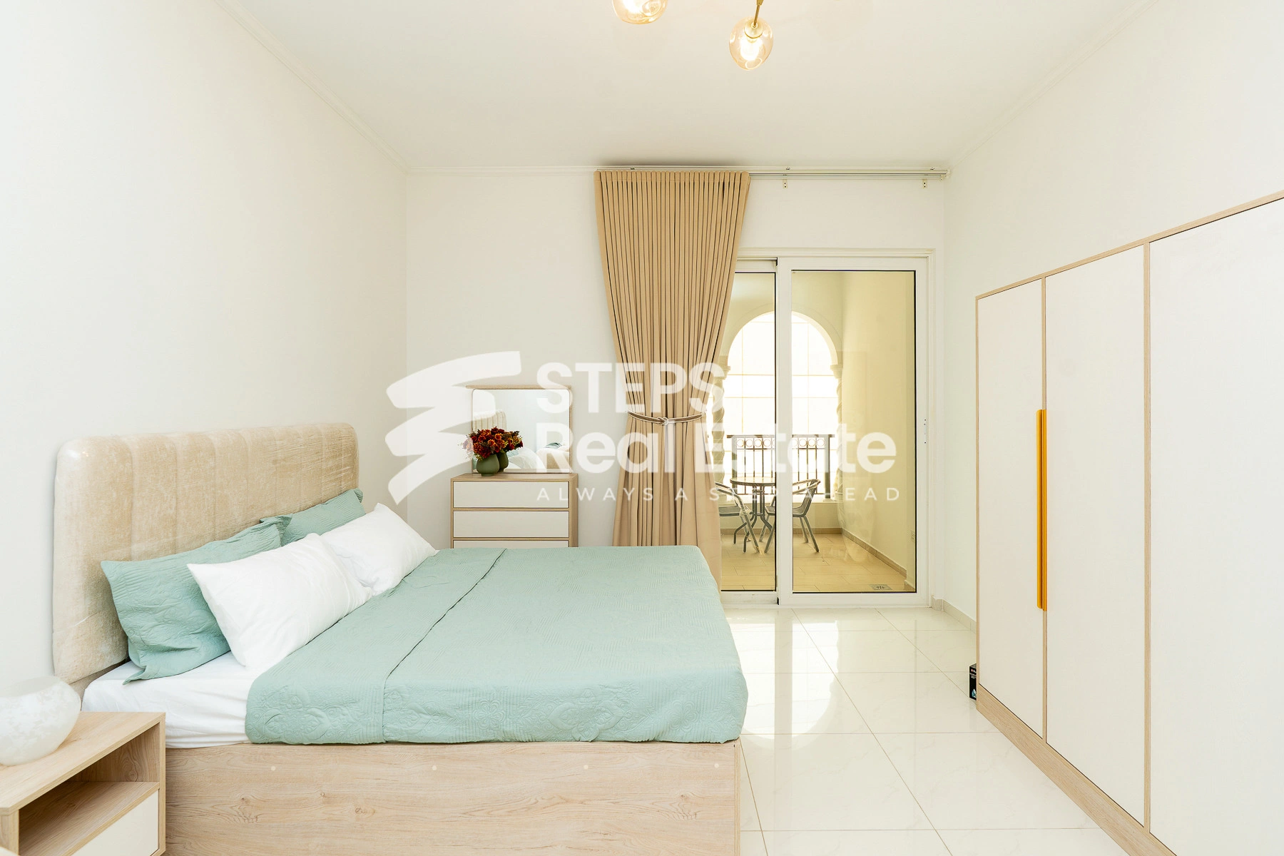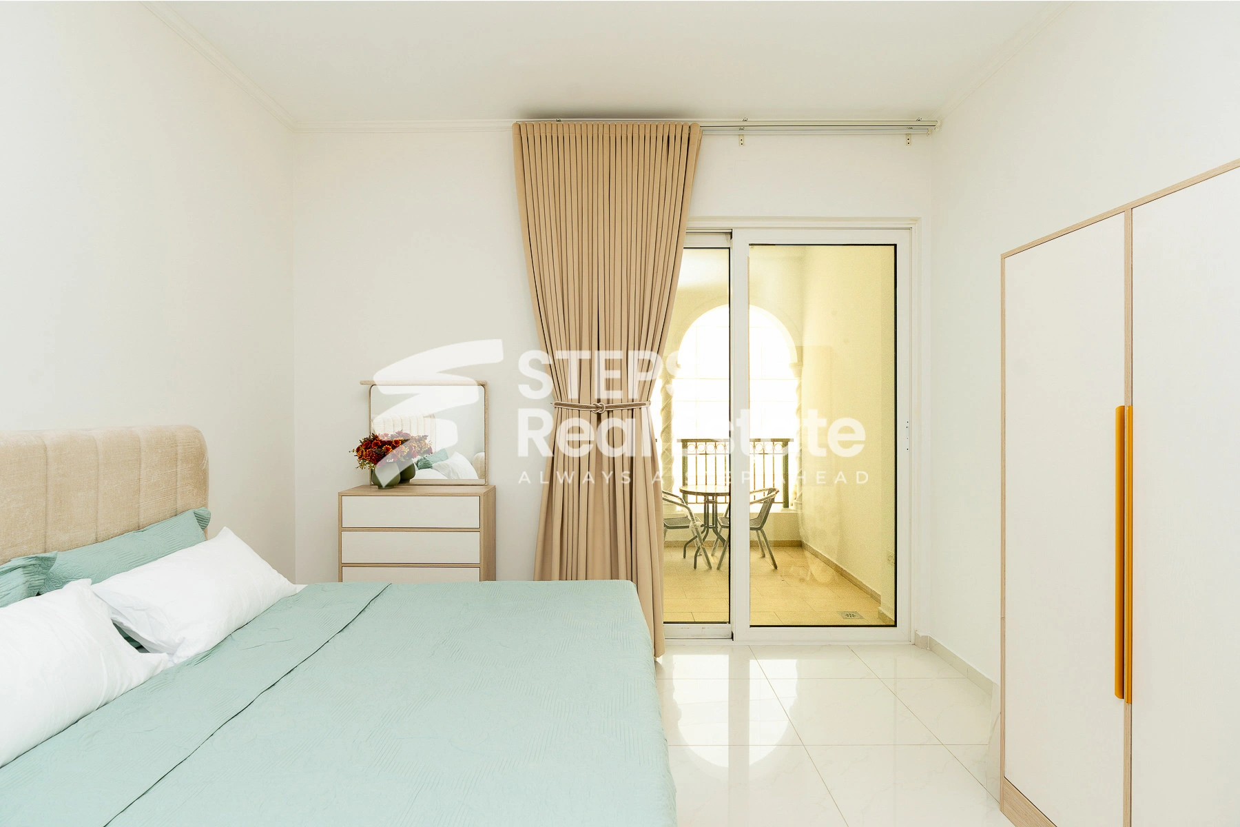 Experience the tranquility of coastal living in this fully furnished apartment, perfectly situated in the highly sought-after Viva Bahriya district of The Pearl Island—one of Qatar’s most prestigious waterfront communities. This modern residence offers a seamless blend of comfort, elegance, and everyday convenience within a vibrant seaside environment known for its resort-style amenities, direct beach access, and refined lifestyle. Ideal for individuals or couples seeking a spacious yet sophisticated home, the apartment features a bright living room filled with natural light, a dedicated dining area, and a contemporary open kitchen designed for both functionality and style. The master bedroom serves as a peaceful retreat, complete with a walk-in closet and an attached bathroom finished to a high standard. Step onto the private balcony to enjoy beautiful sea and city views, creating the perfect setting for relaxation or entertaining guests.